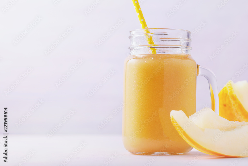 Smoothies cooked from ripe melon in a glass jar with fruit on the table. Food with space for text