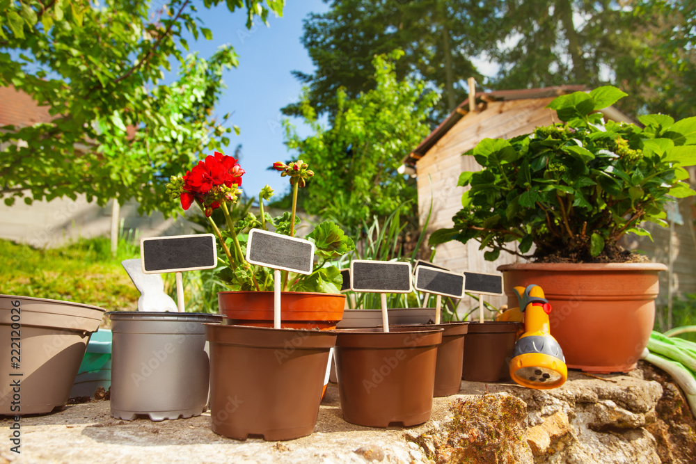 Flower pots with wooden labels in the garden