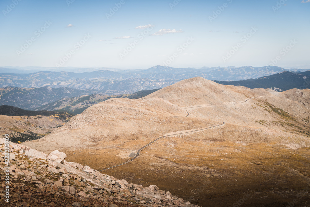 Scenic view of the hillside road leading towards Mount Evans in Colorado.