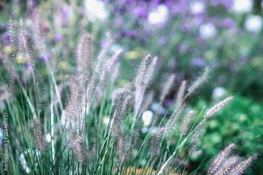 Green grass with decorative ears, summer nature. Summer vivid, colorful, picturesque background