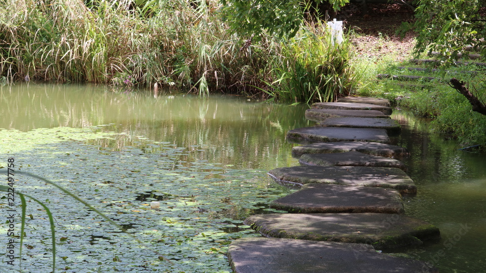 愛知 大府 二ツ池公園 雨上がりの池に流れ込む小川と浮石