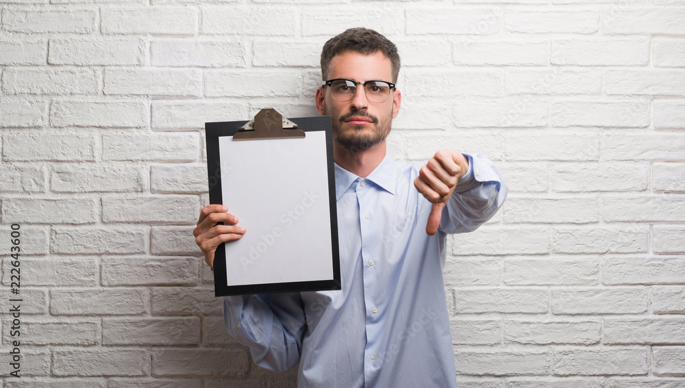 Young adult business man over brick wall holding clipboard with angry face, negative sign showing dislike with thumbs down, rejection concept