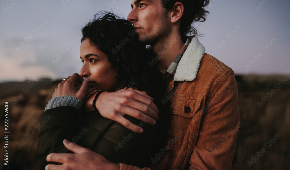 Romantic couple looking landscape view from mountain