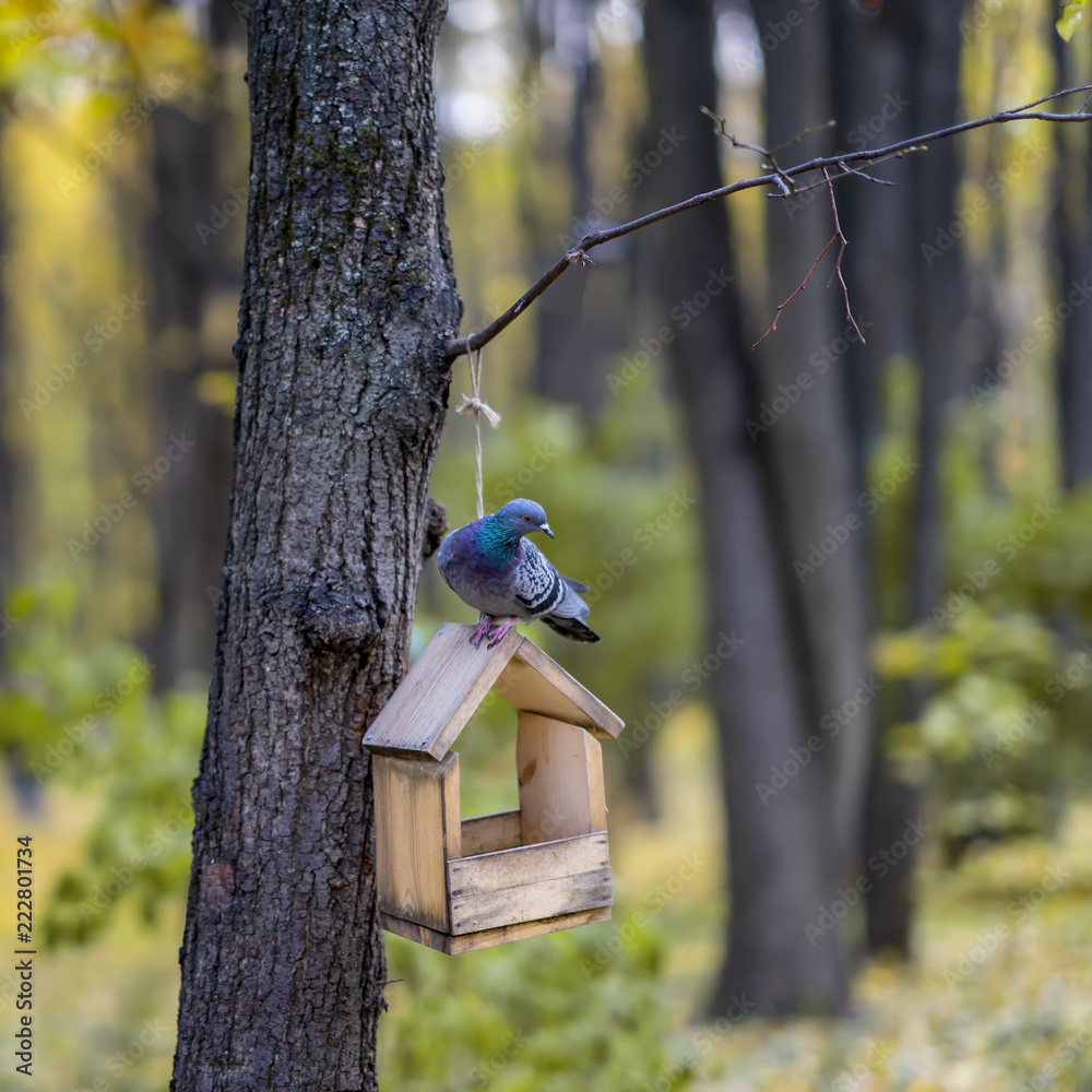 Curious wild pigeon sitting on a wooden bird feeder in the autumn forest