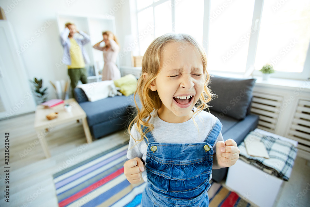 Youthful daughter crying and screaming loudly while being naughty with her shocked parents on background