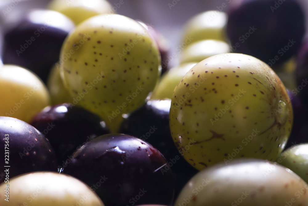 Muscato muscadine sweet green bronze and purple black grape on white marble board