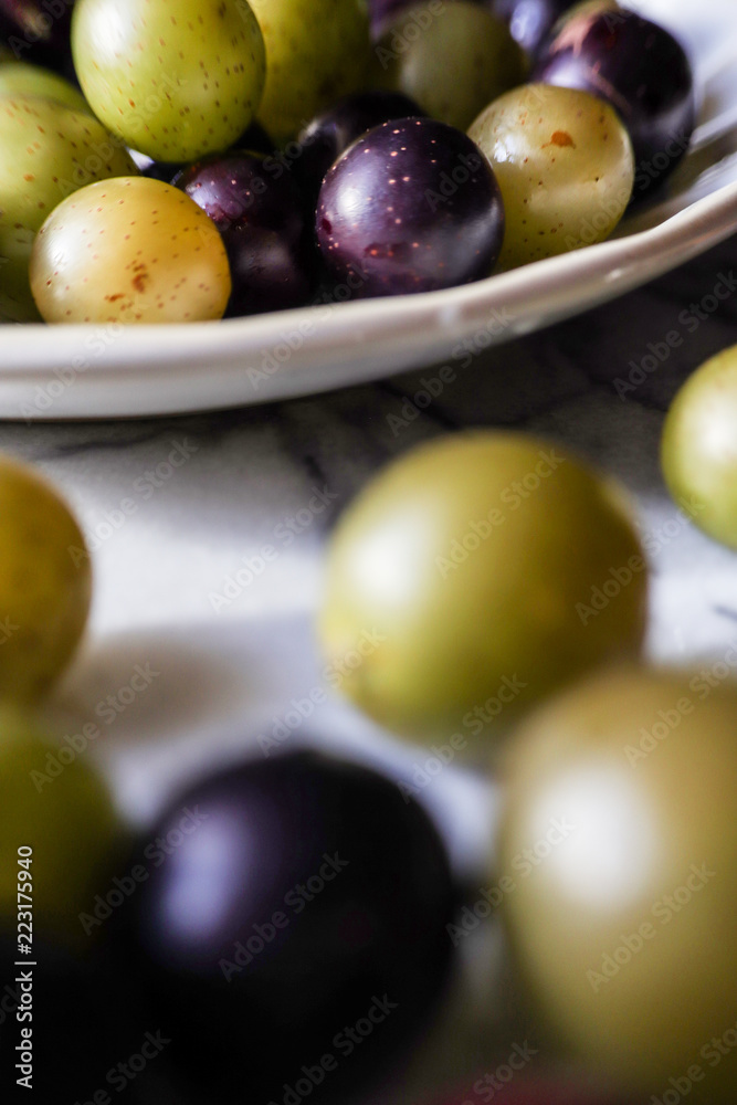 Muscato muscadine sweet green bronze and purple black grape on white marble board