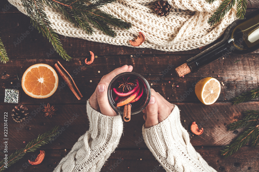 A young woman in a warm, knitted, white pullover is holding a Christmas, hot mulled wine in a glass with spices and citrus fruits. A cozy, winter evening. Winter drinks. Flat lay, top view