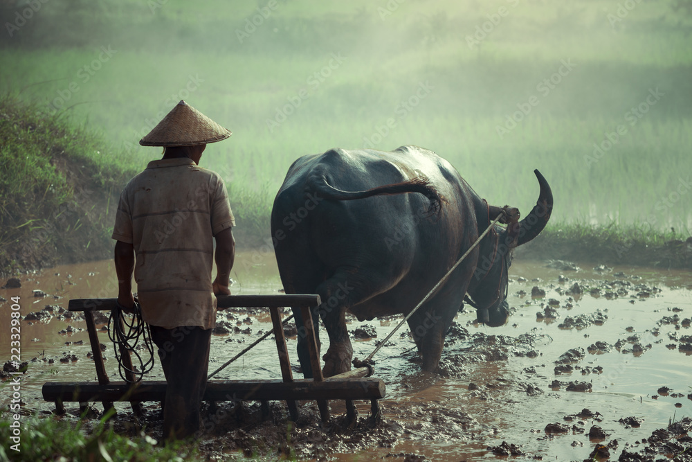 Thailand Farmer in farmland are working plowing with a buffalo, This is tradition Thai farmer in rural Thailand.