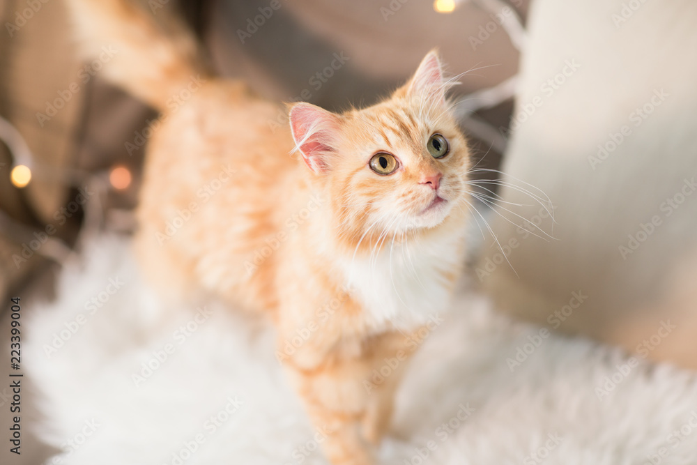 pets, christmas and hygge concept - red tabby cat on sofa with sheepskin at home in winter