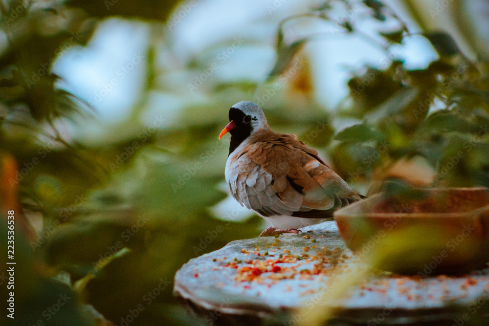 Chinese quail perched on a feeding station in the tropical gardens in the Frederik meijer gardens