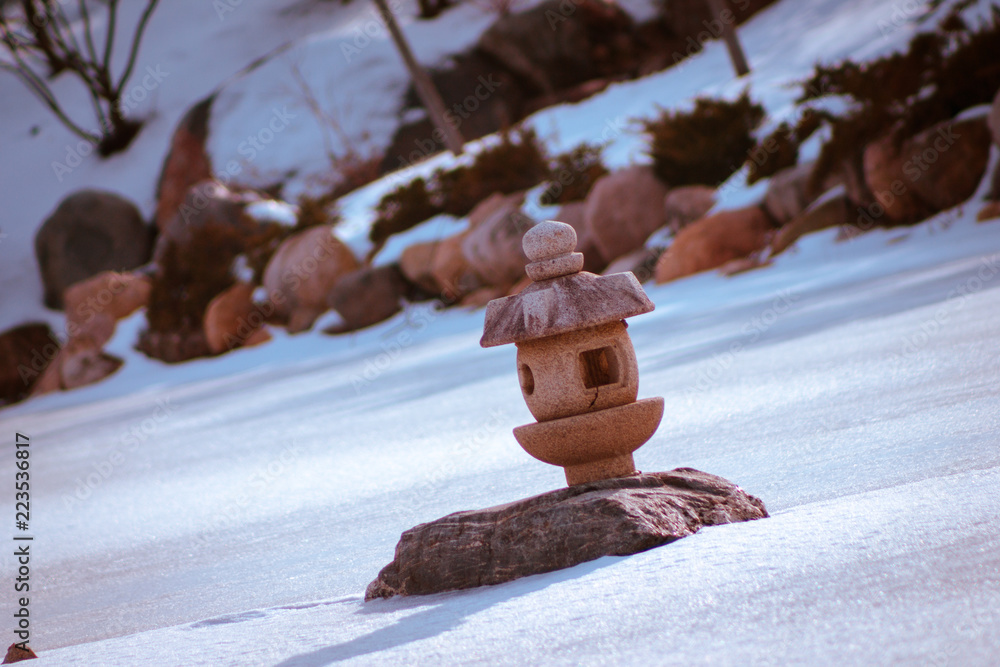 Japanese lantern on a frozen lake in the Frederik Meijer Gardens
