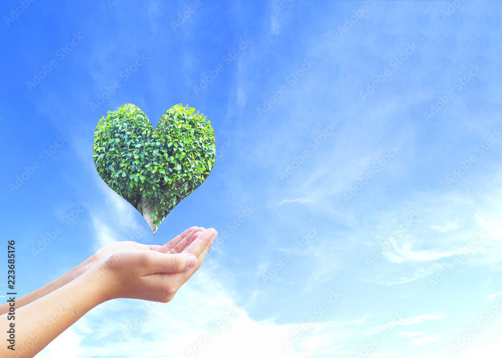World Heart Day concept: man opens palms and drags heart shaped green plants
