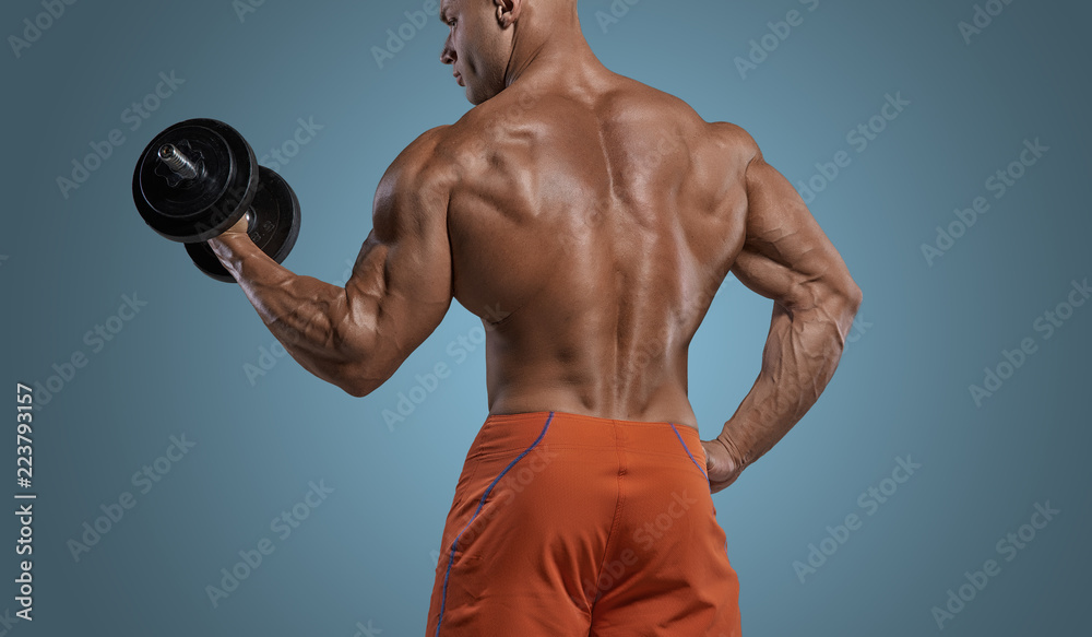Muscular bodybuilder guy doing exercises with dumbbel