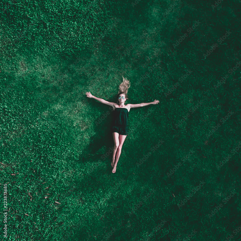 Aerial top view of happy woman relaxing on the grass during sunny summer day