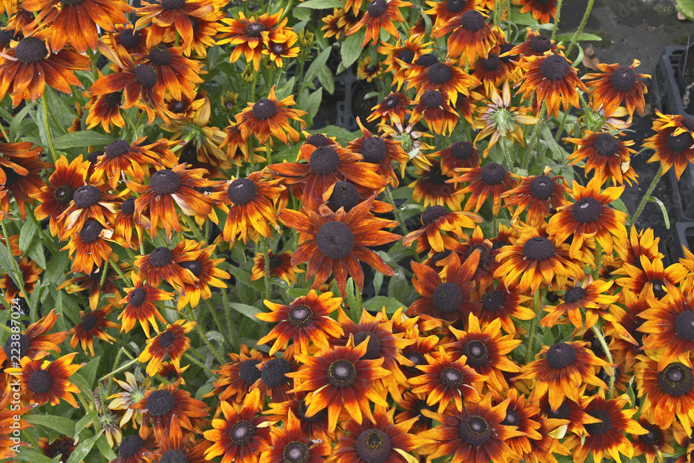 Close up of flowering Rudbeckia 'Summerina Orange' in a flower border