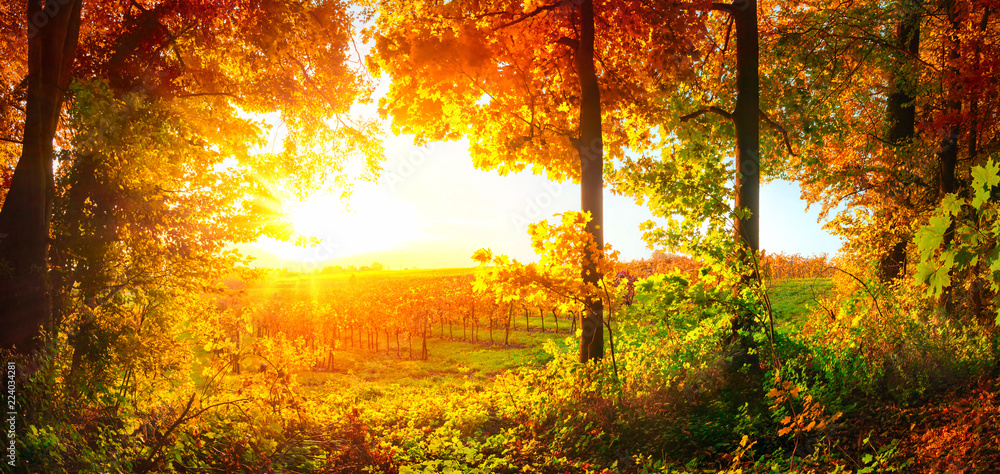 Sonnenuntergang am Waldrand im Herbst, Panorama