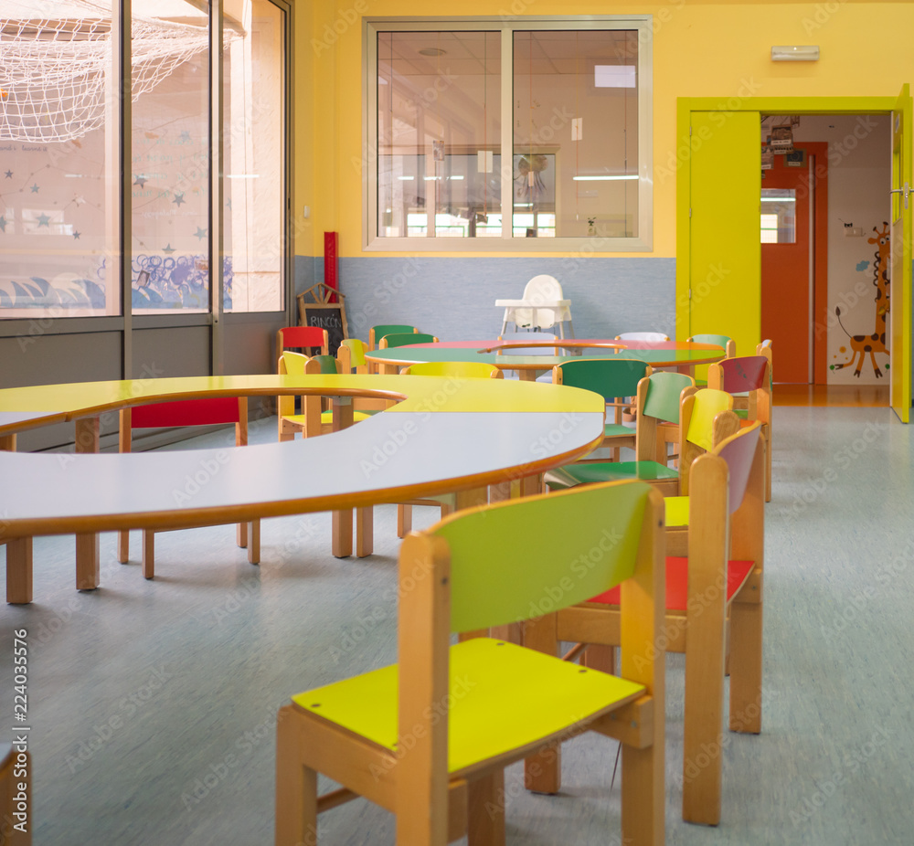Interior view of diner with colorful tables and chairs in kindergarten. Kindergarten concept