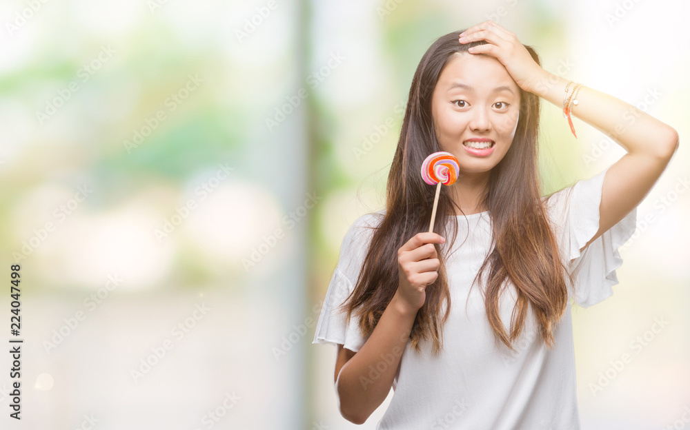 Young asian woman eating lollipop candy over isolated background stressed with hand on head, shocked with shame and surprise face, angry and frustrated. Fear and upset for mistake.