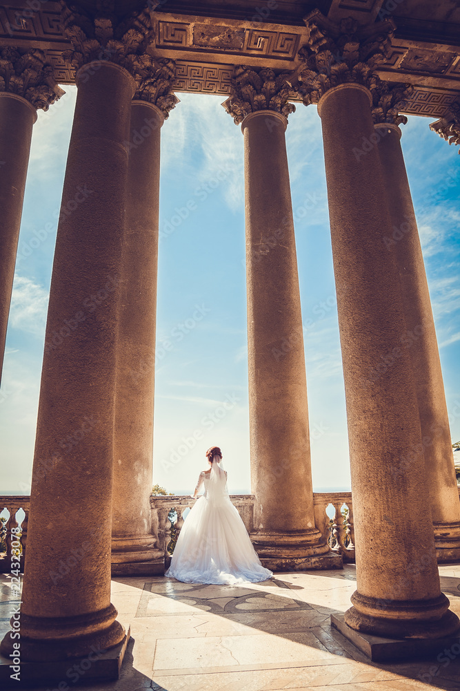 red-haired bride in a white magnificent dress looks at the sky in a large ancient palace with columns, stands with his back to the camera