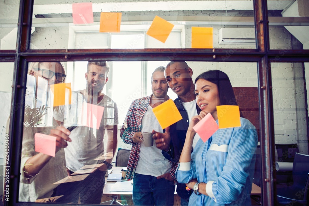 Business people meeting at office and use post it notes to share idea. Brainstorming concept. Sticky note on glass wall