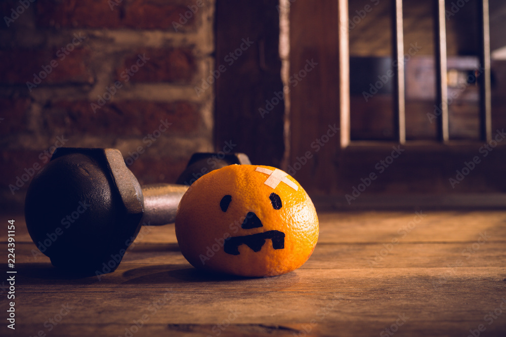Orange with Head Pumpkins haunted spooky face with black iron dumbbell. Halloween Festival with Fitness, Exercise, Working out, weight and dieting, healthy lifestyle background concept.