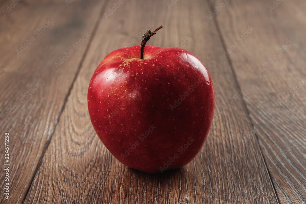 Red apple with water drops on the wooden surface