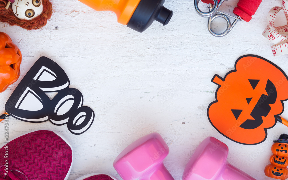 Happy Halloween day with Fitness, Exercise, Working out healthy lifestyle background concept. Flat lay Top view.