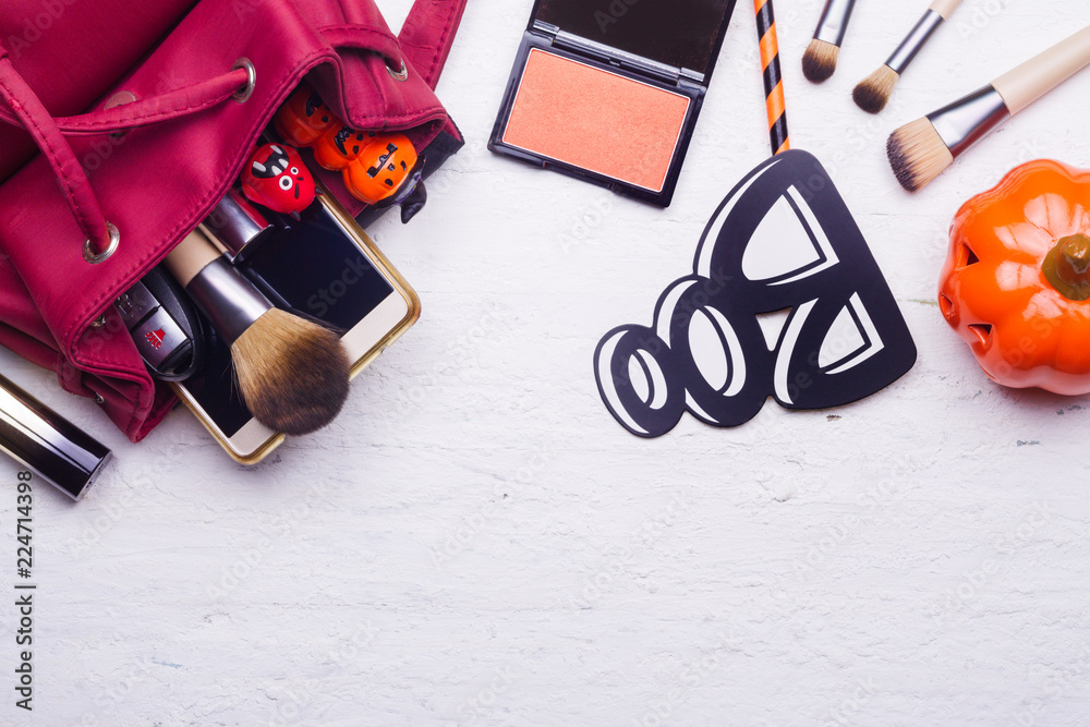 Happy Halloween Festival with female beauty accessories cosmetic fashion flat lay concept.