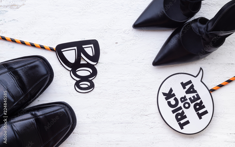 Happy Halloween Festival with female beauty high heels and male black leather shoes with trick or treat sign and boo sign, Halloween fashion shopping and funny concept.