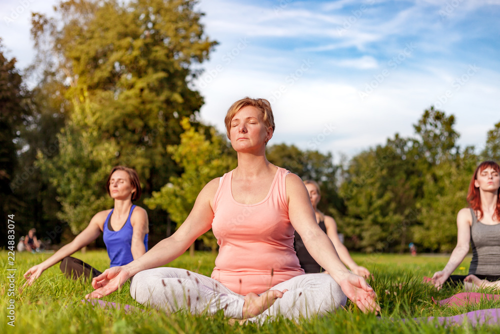 Yoga in the park, senior woman doing exercises with group of mixed age people