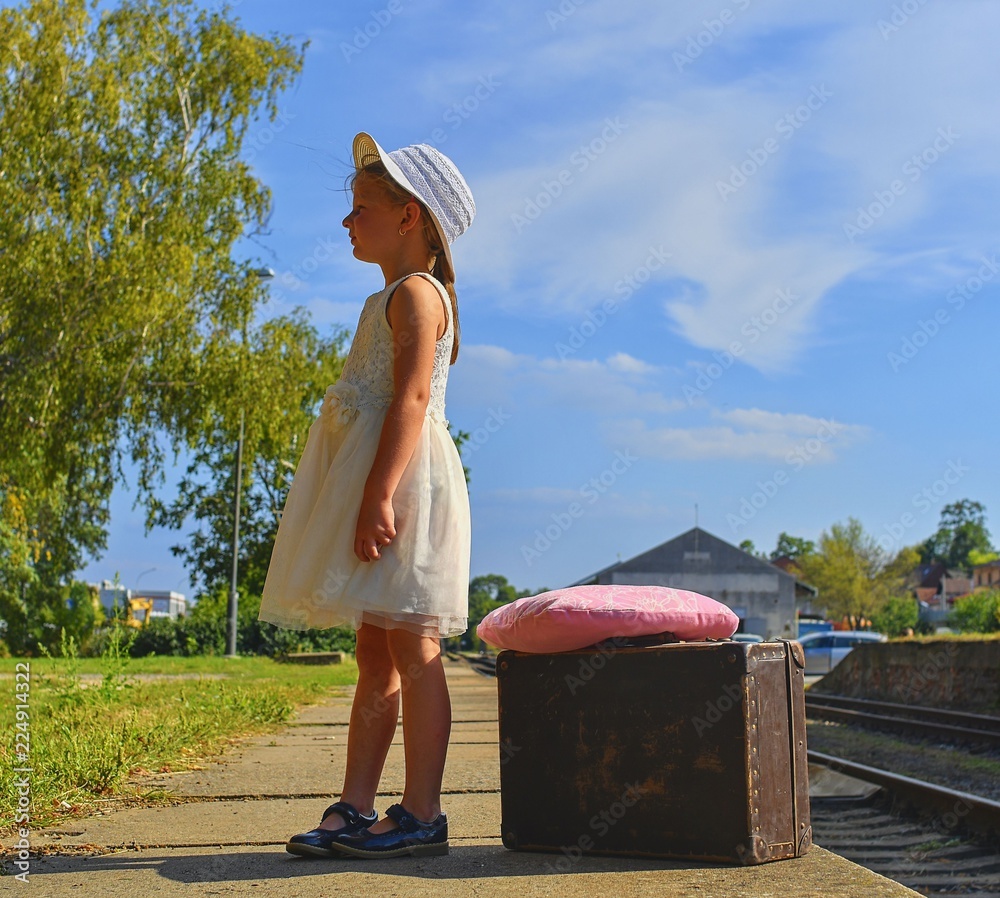 Adorable little girl on a railway station, waiting for the train with vintage suitcase. Traveling, holiday and chilhood concept. Travel insurance concept. Travel, tourism, summer vacation and family