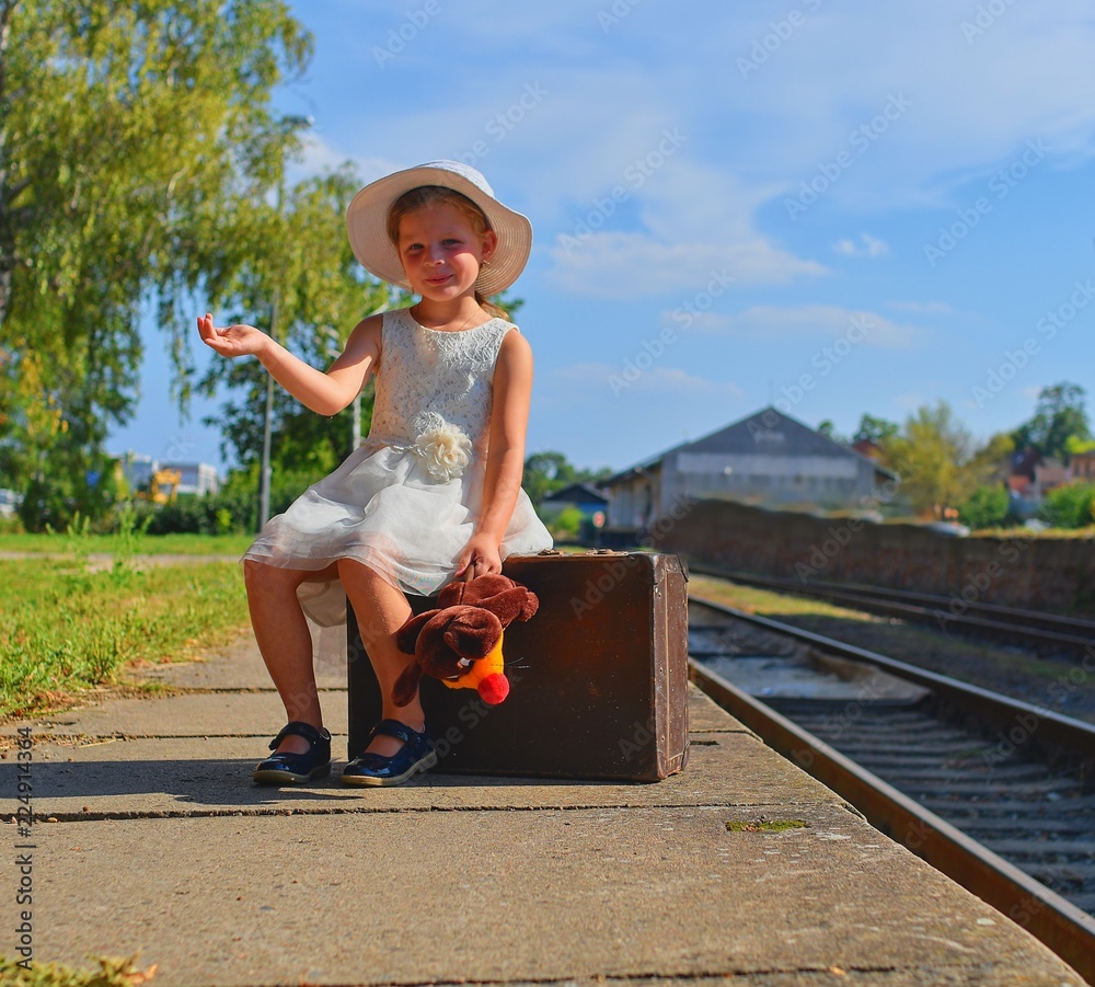 Adorable little girl on a railway station, waiting for the train with vintage suitcase. Traveling, holiday and chilhood concept. Travel insurance concept. Travel, tourism, summer vacation and family