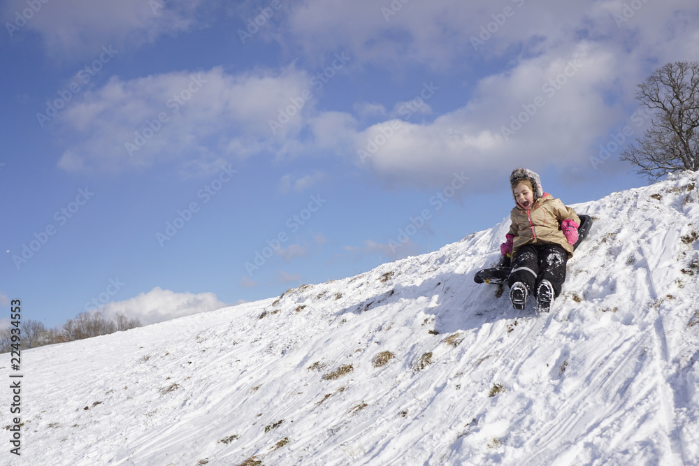 Kleines Mädchen beim Rodeln, Winterfreuden, Schlittenspass