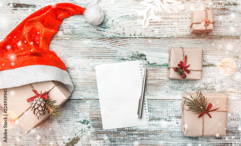 Winter background, Santa's gifts, and letter for wishes and greeting cards for loved ones in winter, xmas, New Year and Christmas. Effect of light blips and snowflakes. Top view.