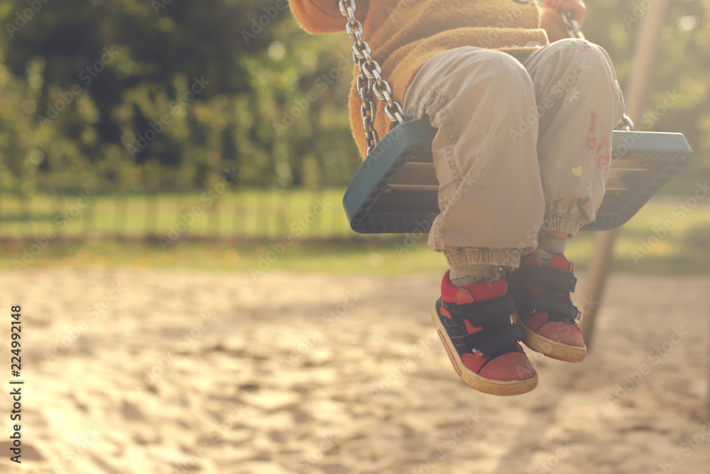Child having fun with swing on a playground in bright afternoon sun - legs angled - matte look