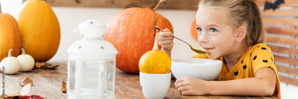 Child eating pumpkin soup in Halloween decorated dinning room. Autumn season food lifestyle banner.