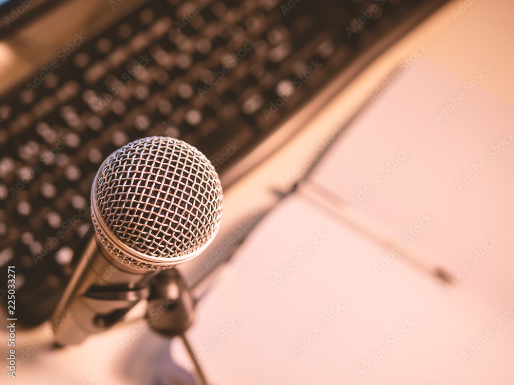 Wireless microphone with computer and notebook. Home studio concept. Top view