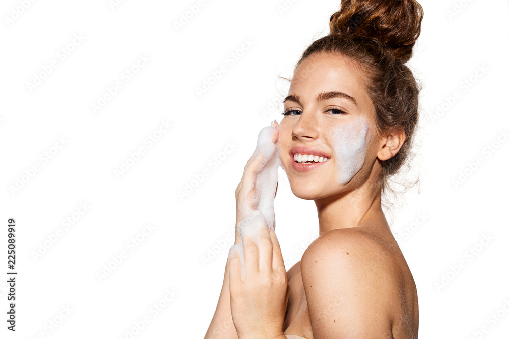Portrait of young pretty girl with healthy skin on white background. Woman smiling and applying cosmetic foam on face. Beauty skincare concept.