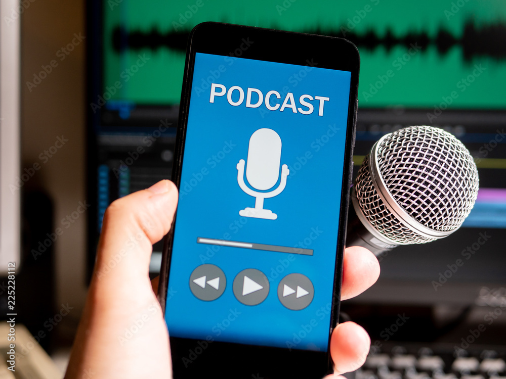 Podcast stuido. Phone with podcast app playing in front of microphone and edting program on screen.