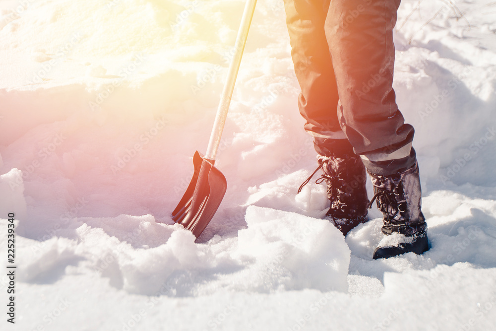 City service cleaning snow winter with shovel after snowstorm yard. sunlight