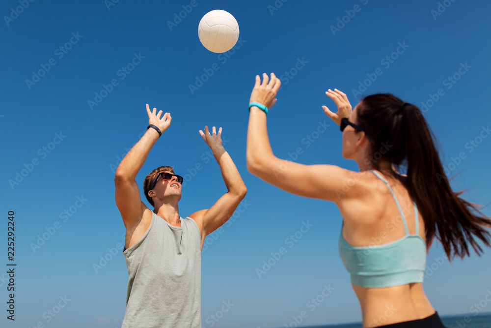 fitness, sport and lifestyle concept - happy couple with ball playing volleyball on summer beach