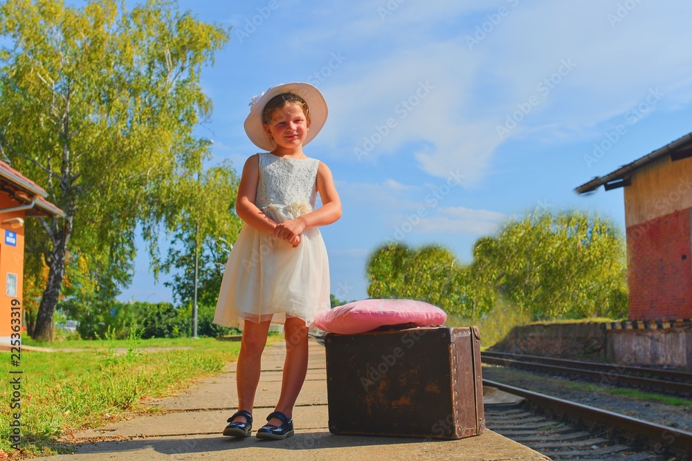 Happy girl on a railway station, waiting for the train with vintage suitcase. Traveling, holiday and chilhood concept. Travel insurance concept. Travel, tourism, summer vacation and family concept