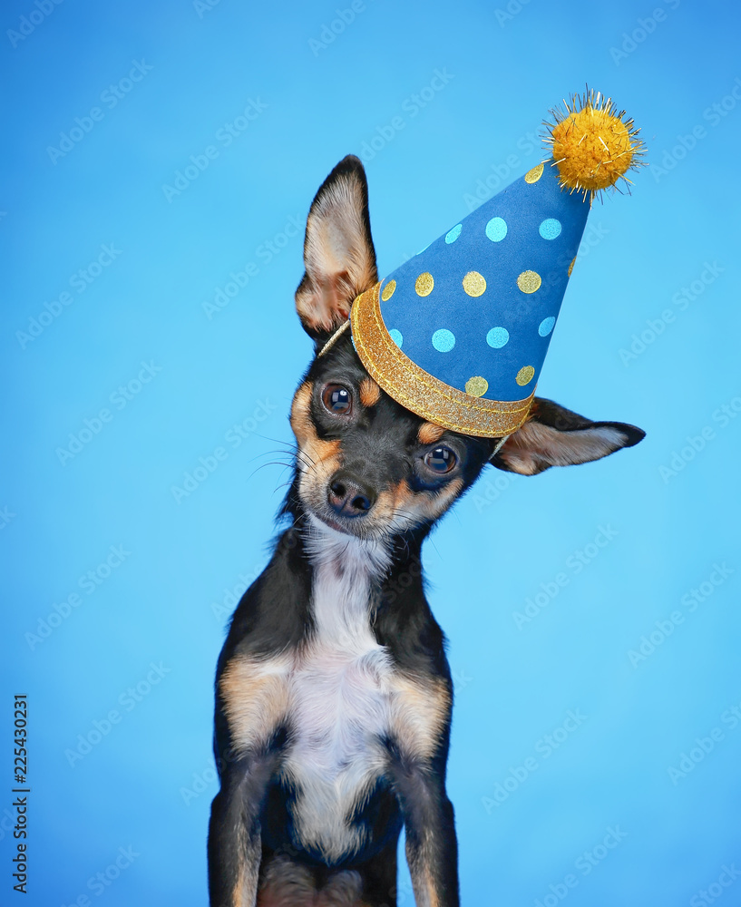 cute chihuahua with a birthday party hat on isolated on a blue background