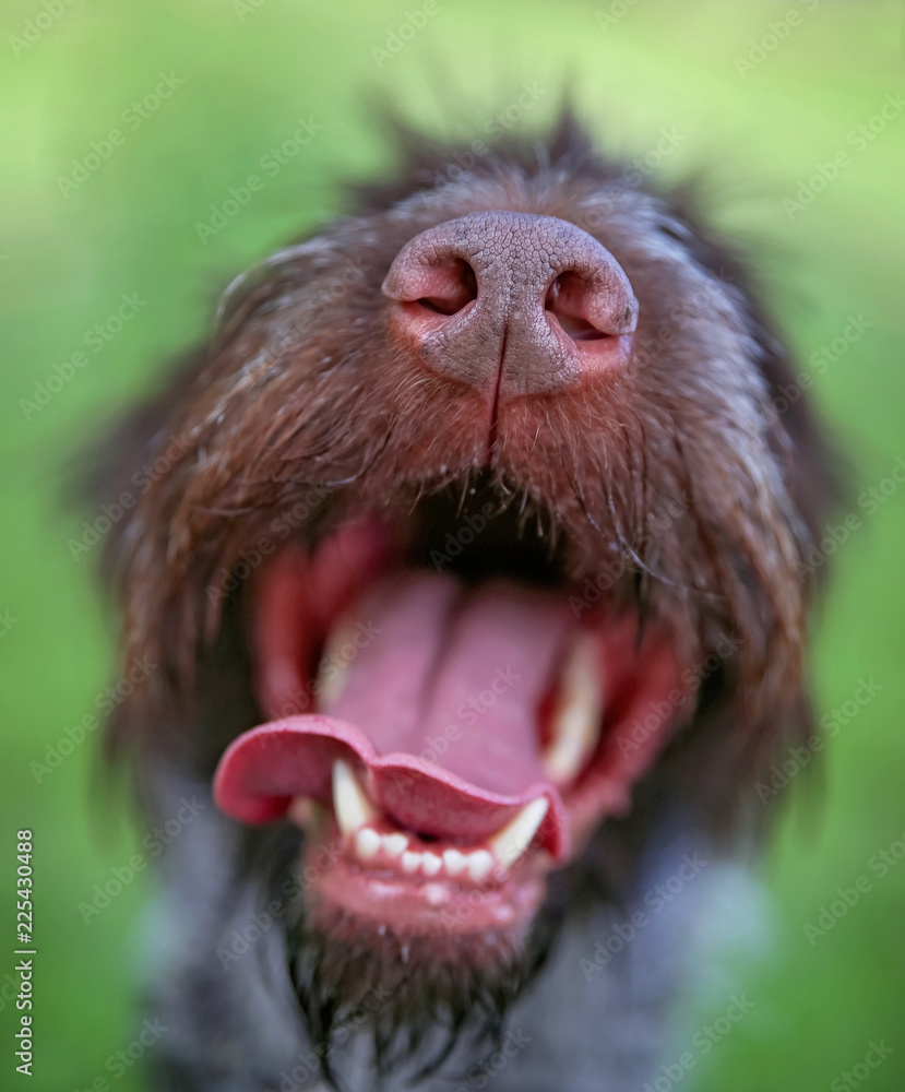 German Wirehaired Pointer panting with an open mouth close to the camera lens