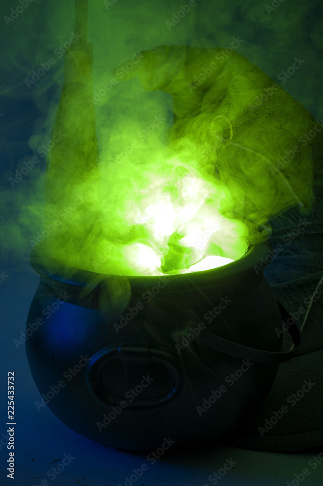 Happy halloween, alchemy and magic spell potion concept with a pot or calderon boiling a green liquid with fumes and smoke coming out, next to a broomstick and a witch or wizard hat