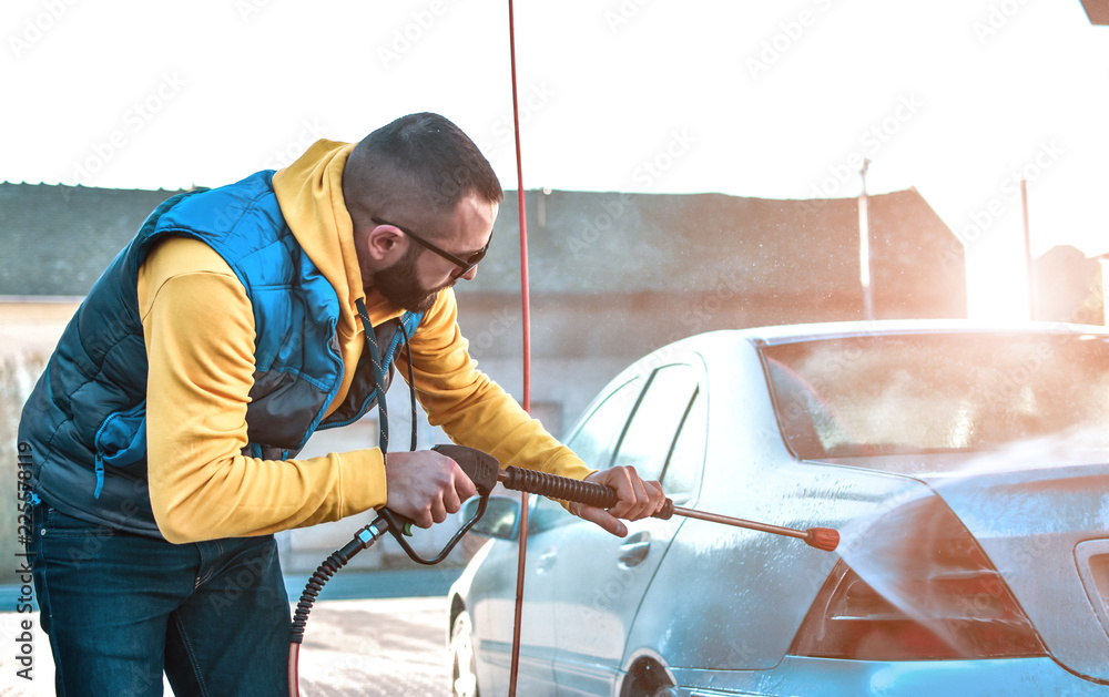 Men Washing His Car Using Self Service Car Wash Equipment.
