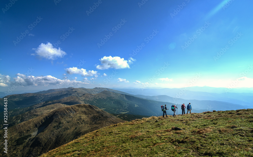 A group of travelers with backpacks travels in the mountains (Goverla mountain, Ukrainian Carpathians)