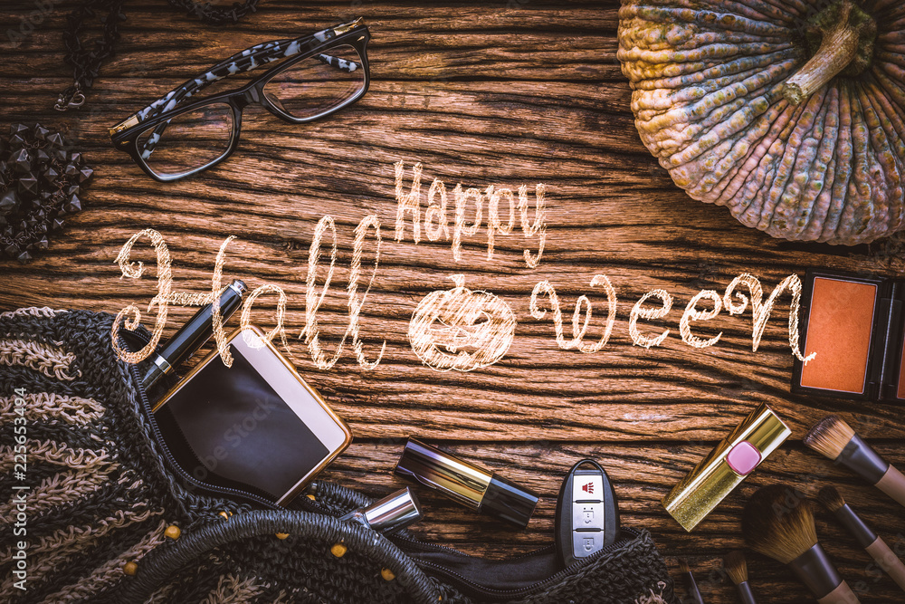 Feminine beauty accessories cosmetic fashion flat lay on grunge wood with gruge pumpkin for Halloween background.