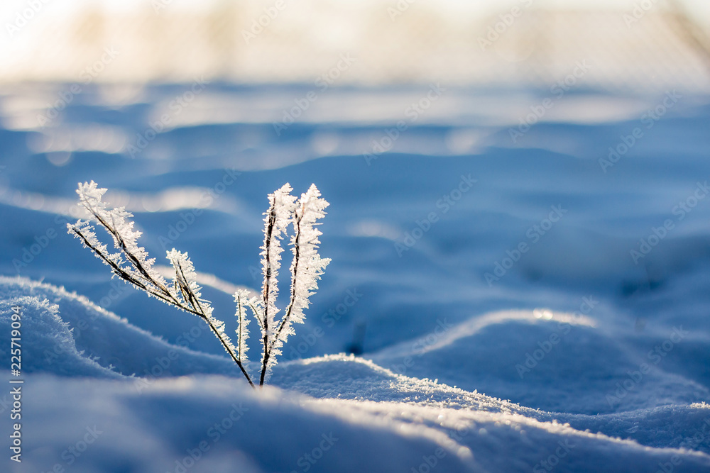 Dry branch, covered with fluffy frost, against the sun in the winter morning_